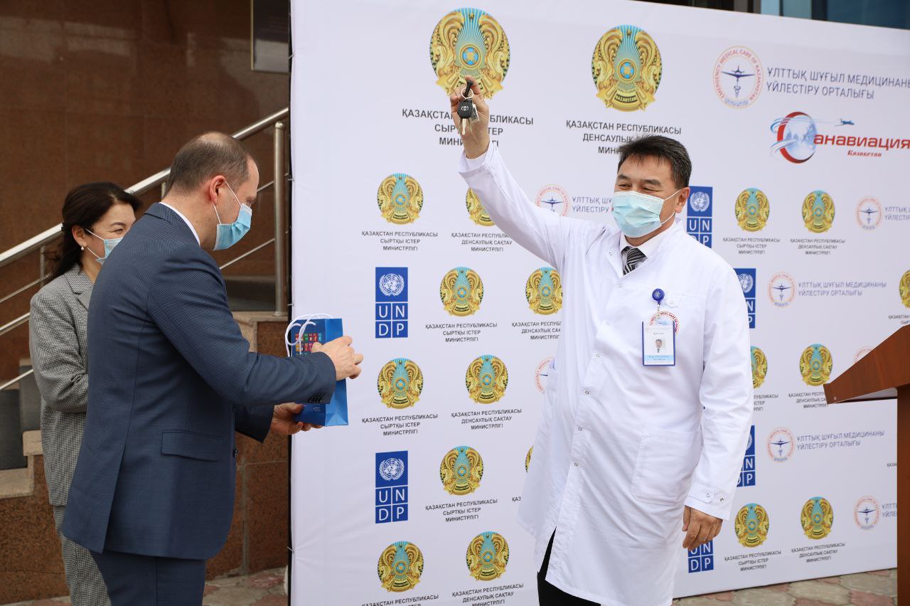 Бүгін Қазақстандағы БҰҰ Даму Бағдарламасы (БҰҰДБ) Қазақстан Республикасы Денсаулық сақтау министрлігінің Ұлттық шұғыл медицинаны үйлестіру орталығына (ҰШМҮО) өтеусіз негізде 5 мамандандырылған жедел медициналық жәрдем автокөлігін ресми сыйға тартты.