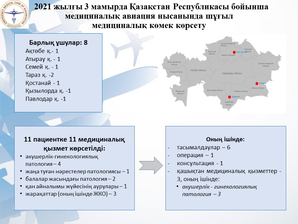 2021 жылғы 3 мамырда сағат 21:20-да құрамында анестезиолог-реаниматолог дәрігер және реанимация мейіргері бар медициналық авиацияның арнайы бортымен пациентті одан әрі емдеу үшін Атырау қаласына сәтті тасымалдау жүзеге асырылды.