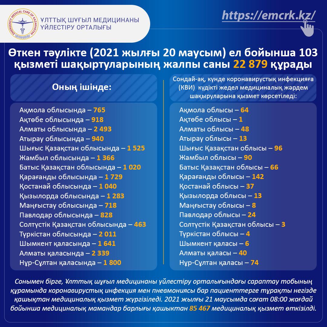 Өткен тәулікте (2021 жылғы 20 маусым) ел бойынша 103 қызметі шақыртуларының жалпы саны 22 879 құрады