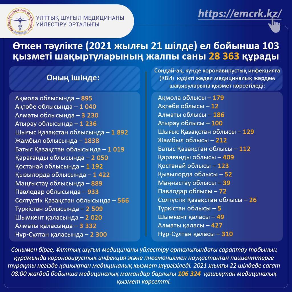 Өткен тәулікте (2021 жылғы 21 шілде) ел бойынша 103 қызметі шақыртуларының жалпы саны 28 363 құрады