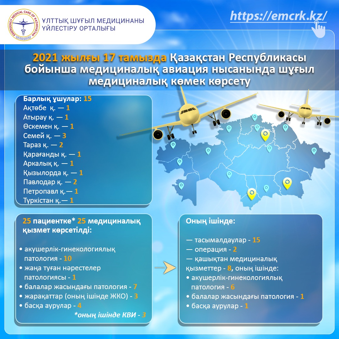 17 тамызда пациенттің жай-күйін, сондай - ақ босануда қан кетудің жоғары қаупін, дене салмағы төмен шала туған баланың туылуын ескере отырып, құрамында анестезиолог-реаниматолог және гинеколог дәрігер бар медициналық авиация желісі бойынша борттың ұшуы ұйымдастырылды, жүкті әйел Павлодар қаласының Облыстық перинаталдық орталығына тасымалданды.