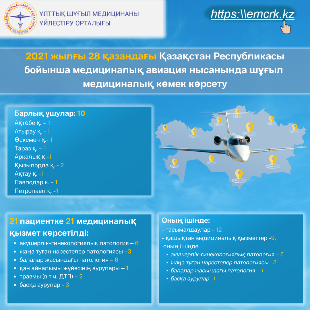 2021 жылғы 28 қазандағы Қазақстан Республикасы бойынша медициналық авиация нысанында шұғыл медициналық көмек көрсету