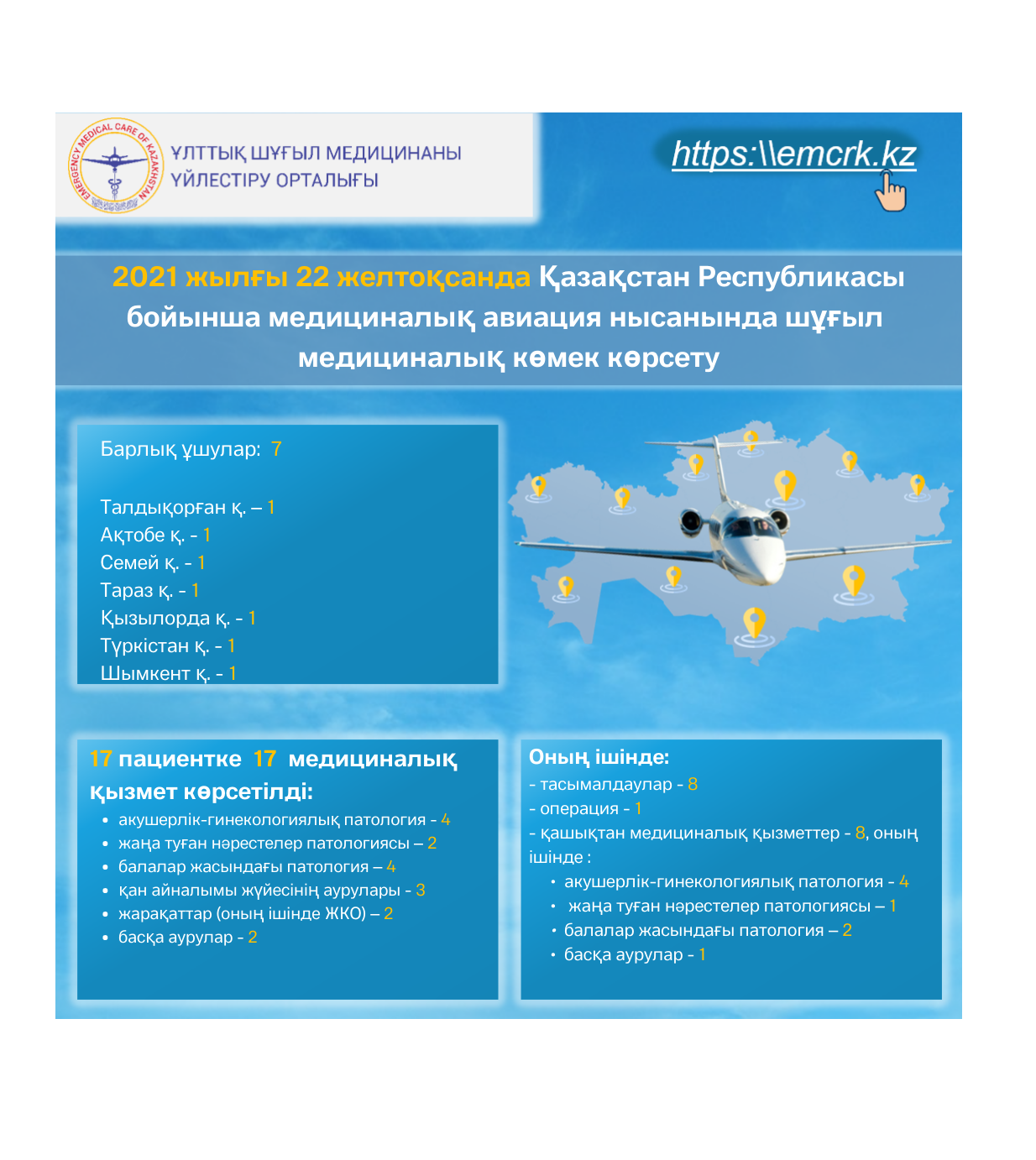 2021 жылғы 22 желтоқсанда Қазақстан Республикасы бойынша медициналық авиация нысанында шұғыл медициналық көмек көрсету.
