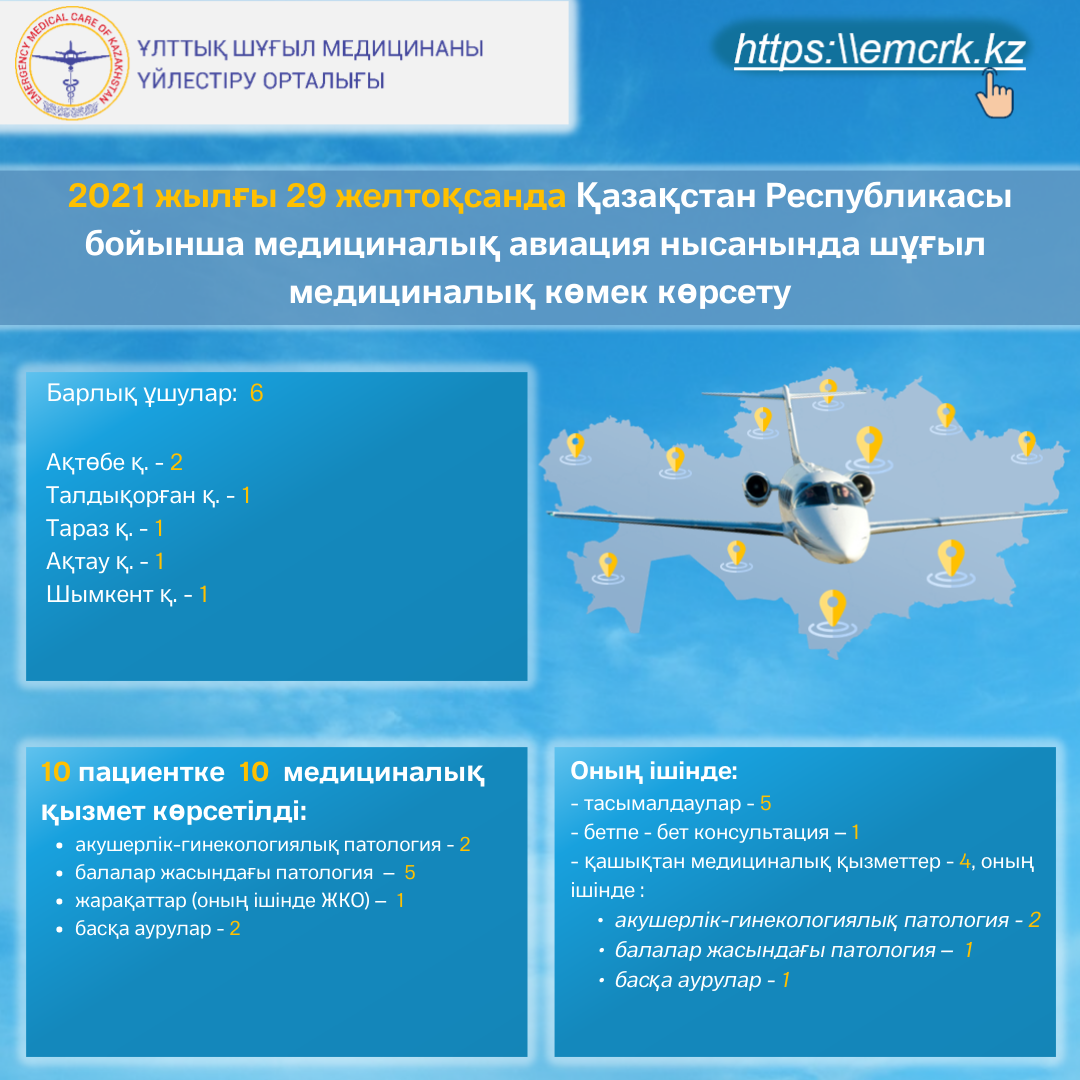 2021 жылғы 29 желтоқсанда Қазақстан Республикасы бойынша медициналық авиация нысанында шұғыл медициналық көмек көрсету.