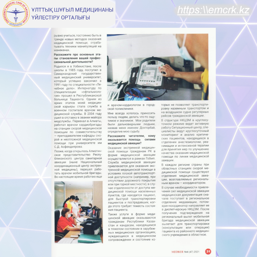 ҰШМҮО медициналық авиацияның мобильдік бригадасының дәрігері Д. Әйтековпен сұхбат, "Медикер" журналы № 4 (47), желтоқсан 2021 ж.