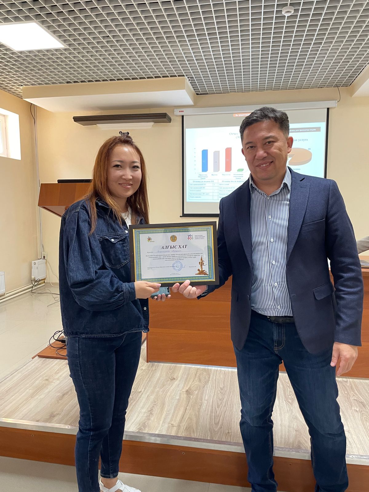 Мемлекеттік тілді дамытуға қосқан үлесі үшін алғыс хаттармен: Іс қағаздарын жүргізу және мемлекеттік тіл бөлімінің бас маманы – Бақтиярова Меруерт Оралқызы, медициналық блоктың меңгерушісі – Ырымбаева Назигүл Жарасқызы марапатталды.