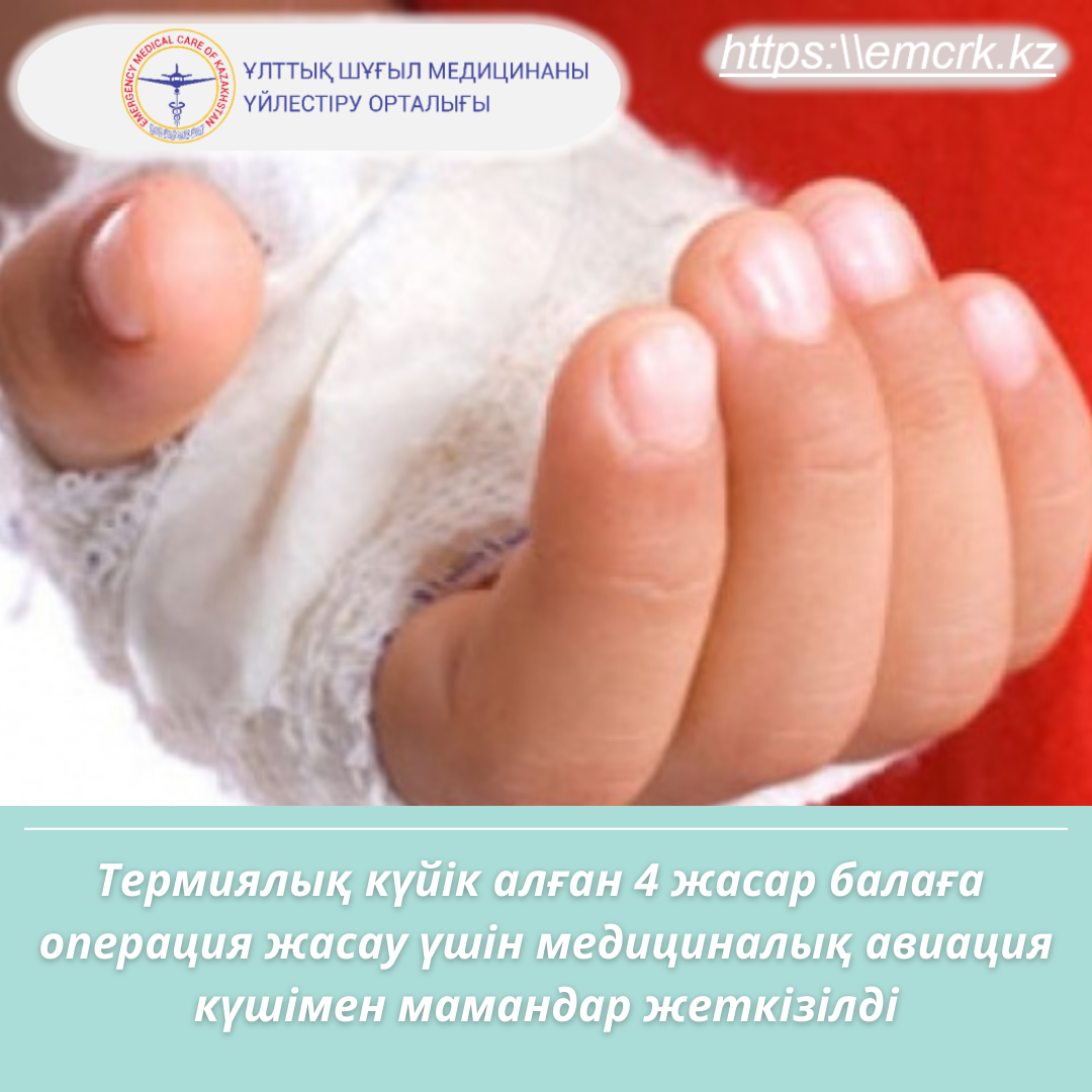 Жедел медициналық жәрдем бригадасы II-III AB дәрежелі термиялық күйік алған 70-79% 4 жастағы баланы Қызылорда қаласындағы Көпбейінді облыстық балалар ауруханасына жеткізді.