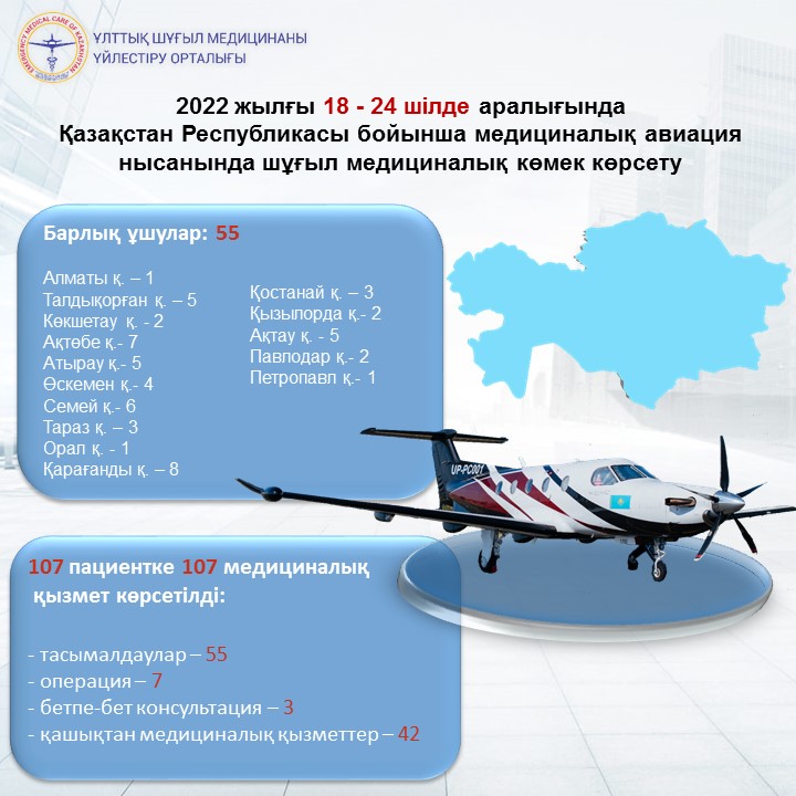 2022 жылғы 18-24 шілде Қазақстан Республикасы бойынша медициналық авиация нысанында шұғыл медициналық көмек көрсету