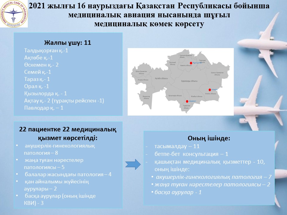 2021 жылғы 16 наурыздағы Қазақстан Республикасы бойынша медициналық авиация нысанында шұғыл медициналық көмек көрсету