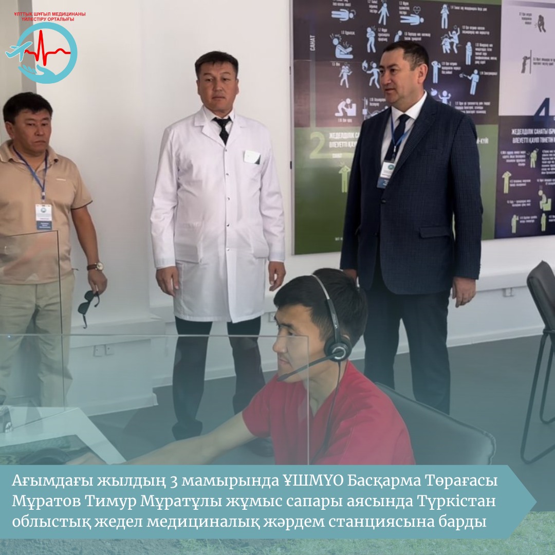 Ағымдағы жылдың 3 мамырында ҰШМҮО Басқарма Төрағасы Мұратов Тимур Мұратұлы жұмыс сапары аясында Түркістан облыстық жедел медициналық жәрдем станциясына барды.