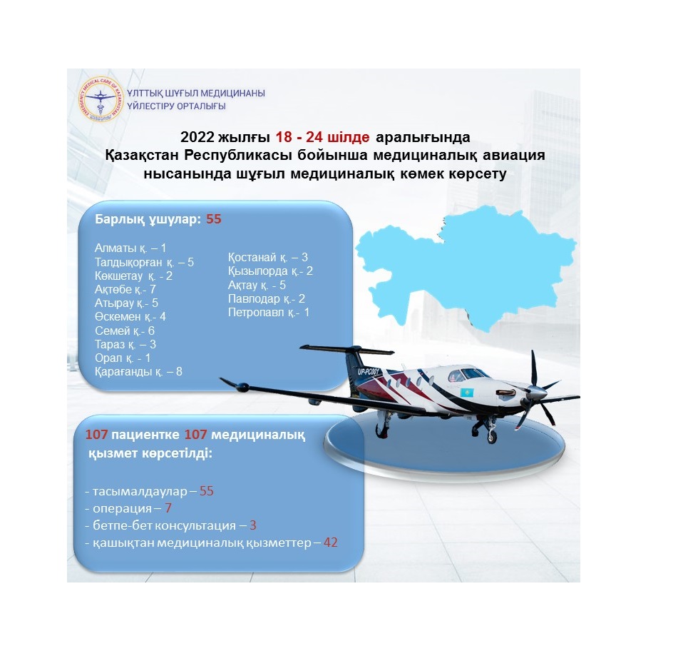 2022 жылғы 18-24 шілде Қазақстан Республикасы бойынша медициналық авиация нысанында шұғыл медициналық көмек көрсету
