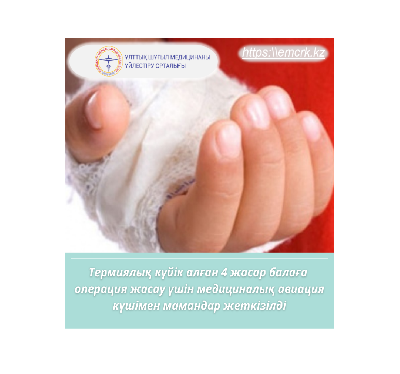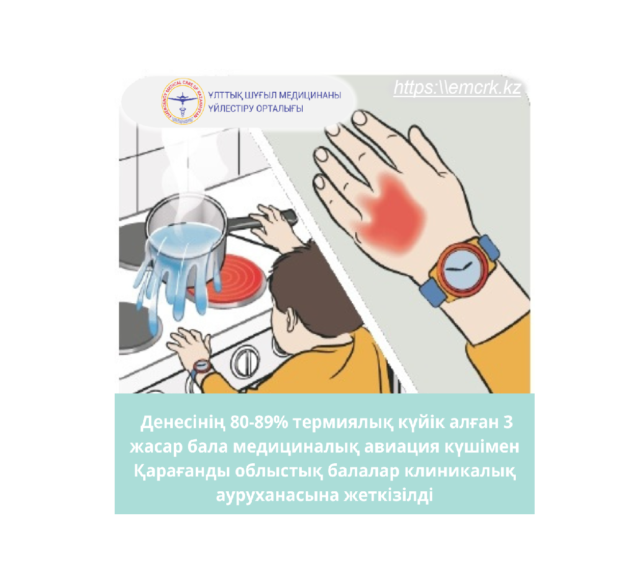 Денесінің 80-89% термиялық күйік алған 3 жасар бала медициналық авиация күшімен Қарағанды облыстық балалар клиникалық ауруханасына жеткізілді