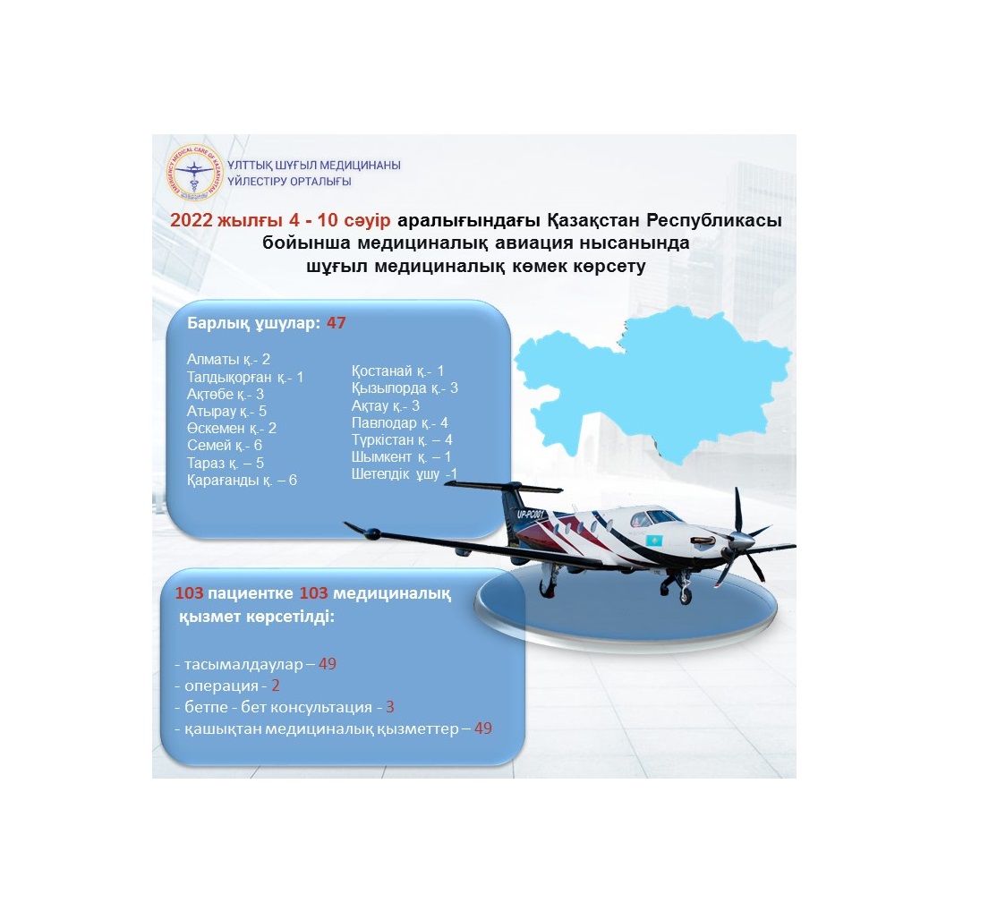 2022 жылғы 4 - 10 сәуір аралығындағы Қазақстан Республикасы бойынша медициналық авиация нысанында шұғыл медициналық көмек көрсету