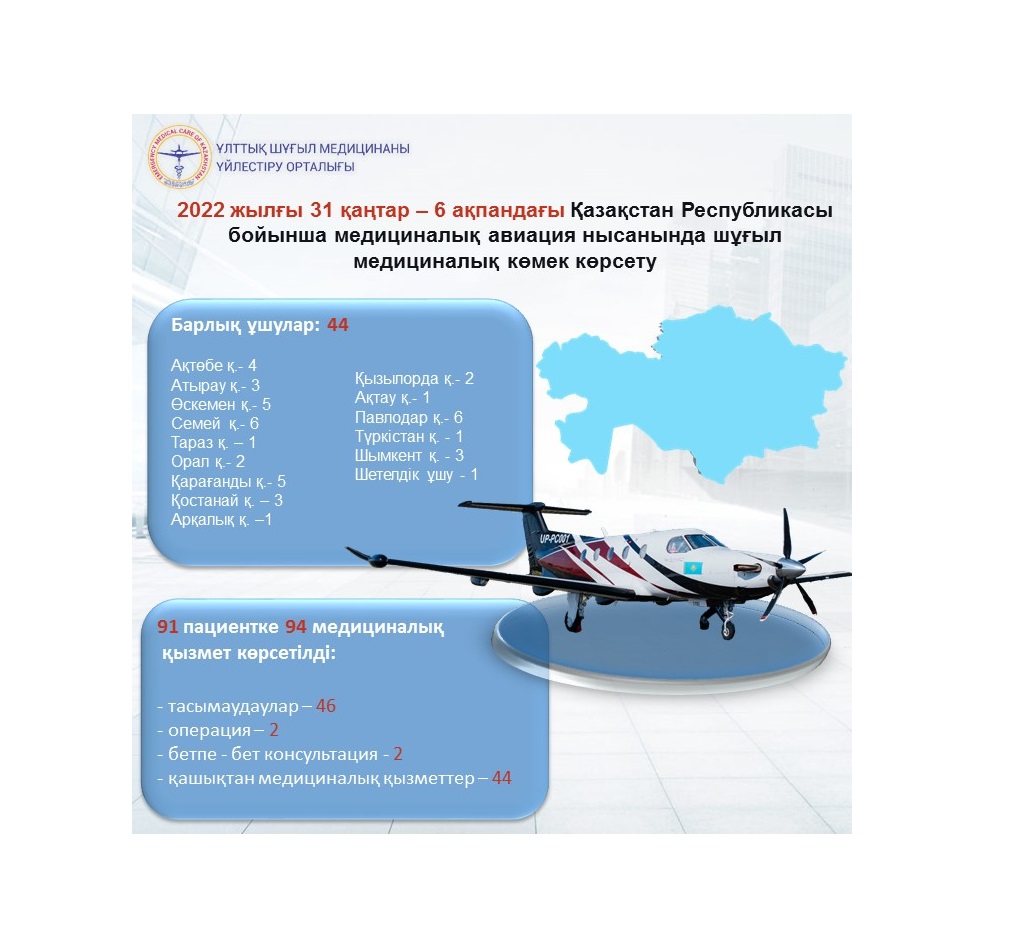 2022 жылғы 31 қаңтар – 6 ақпандағы Қазақстан Республикасы бойынша медициналық авиация нысанында шұғыл медициналық көмек көрсету
