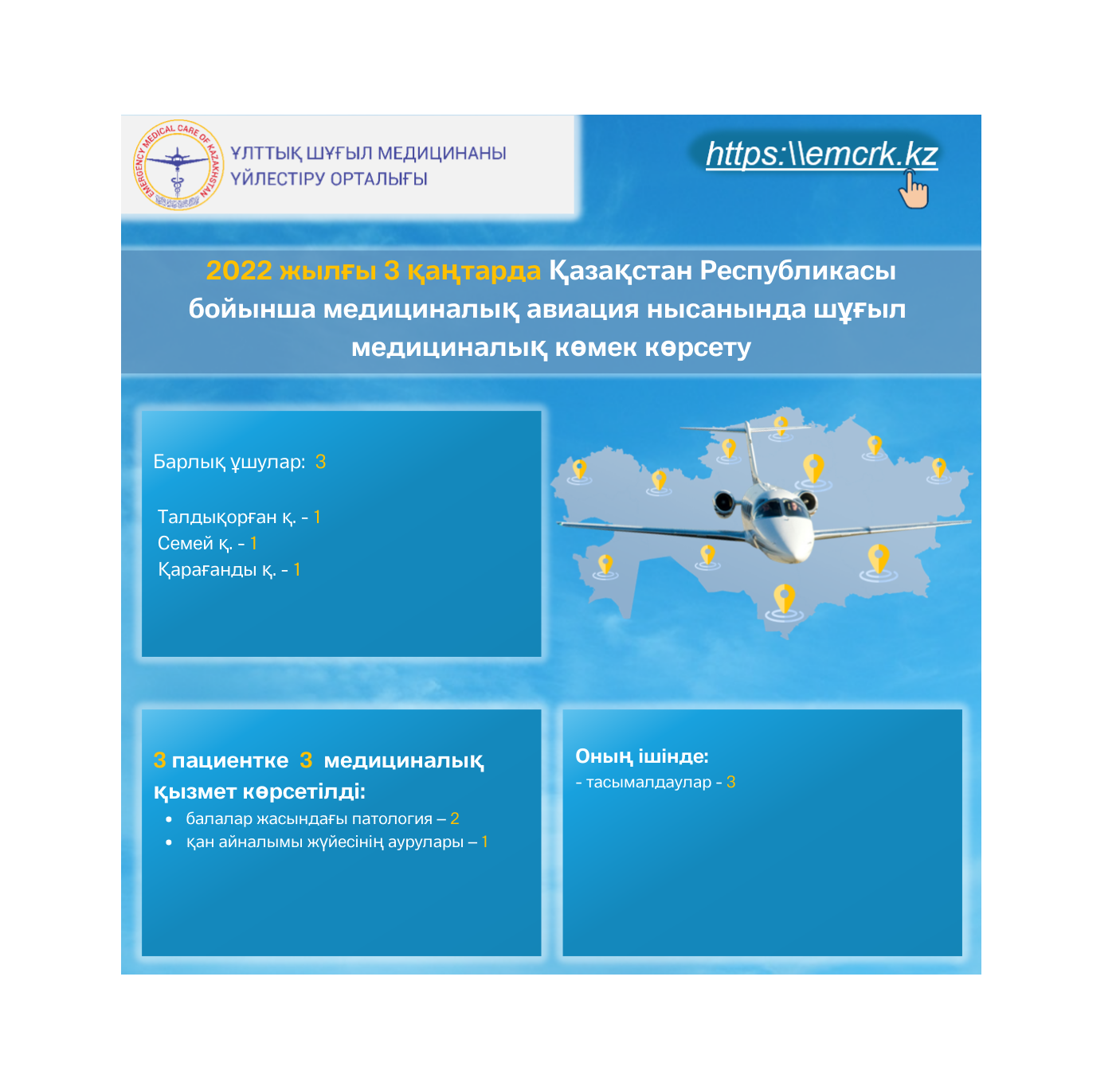 2022 жылғы 3 қаңтарда Қазақстан Республикасы бойынша медициналық авиация нысанында шұғыл медициналық көмек көрсету