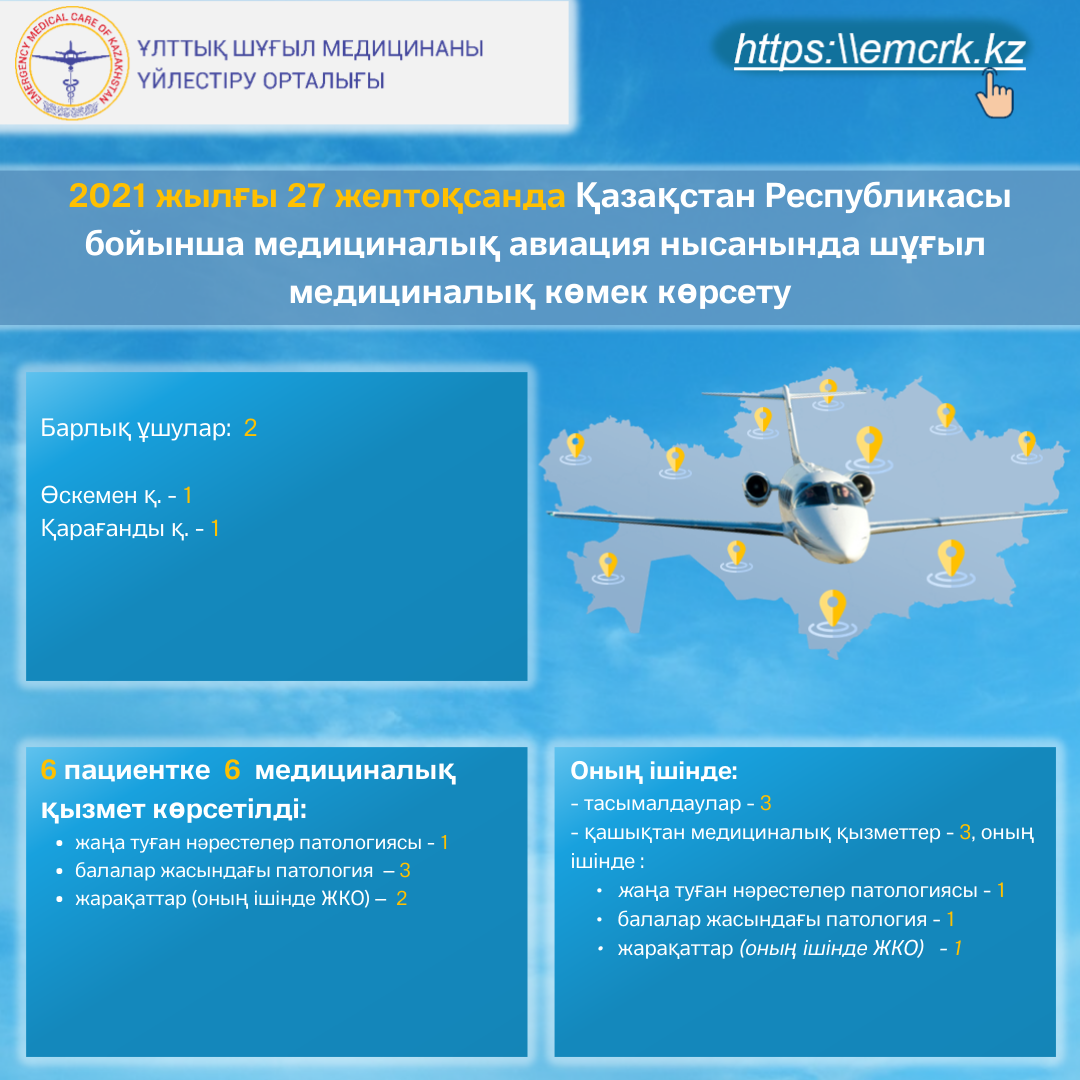 2021 жылғы 27 желтоқсанда Қазақстан Республикасы бойынша медициналық авиация нысанында шұғыл медициналық көмек көрсету