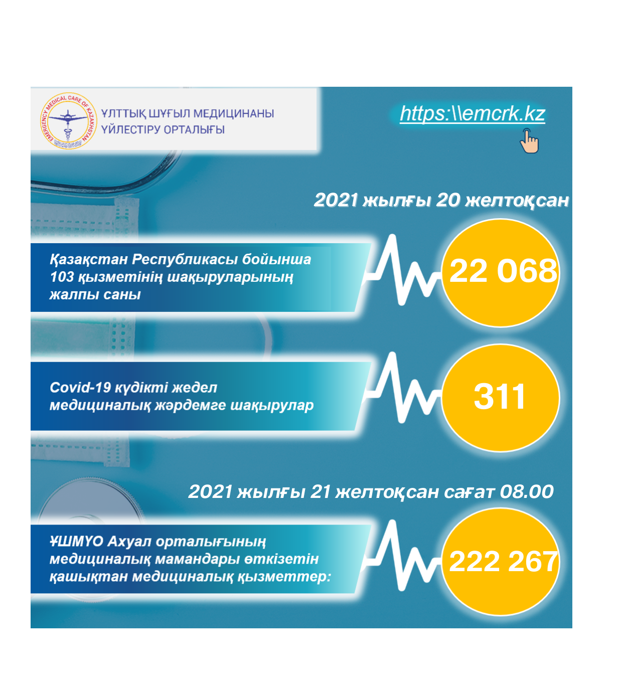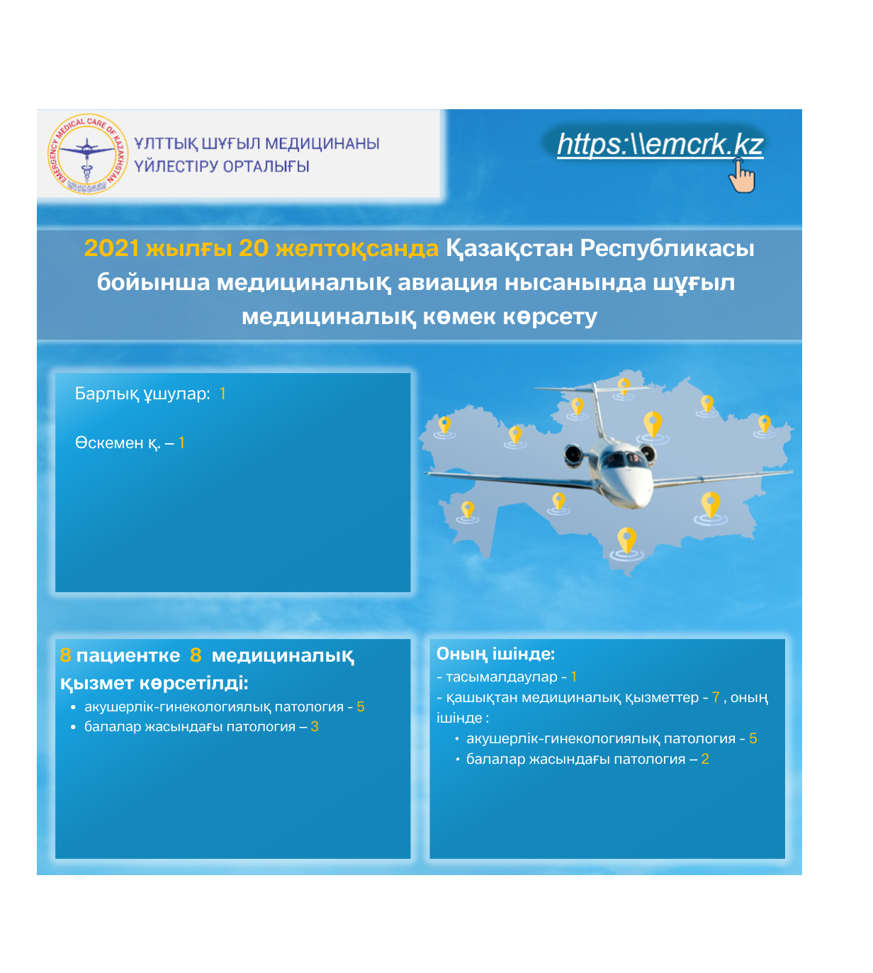2021 жылғы 20 желтоқсанда Қазақстан Республикасы бойынша медициналық авиация нысанында шұғыл медициналық көмек көрсету.