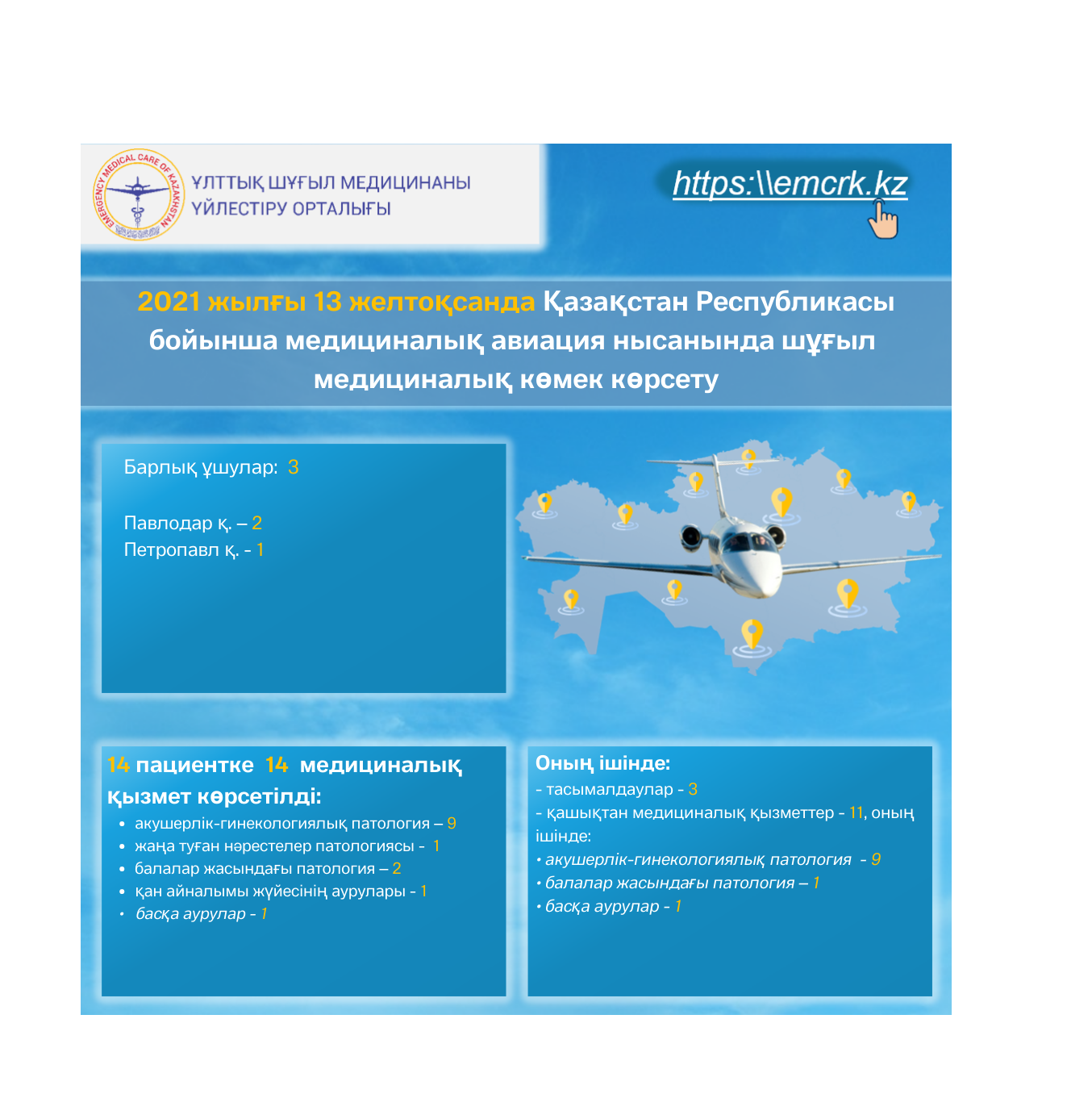 2021 жылғы 13 желтоқсанда Қазақстан Республикасы бойынша медициналық авиация нысанында шұғыл медициналық көмек көрсету