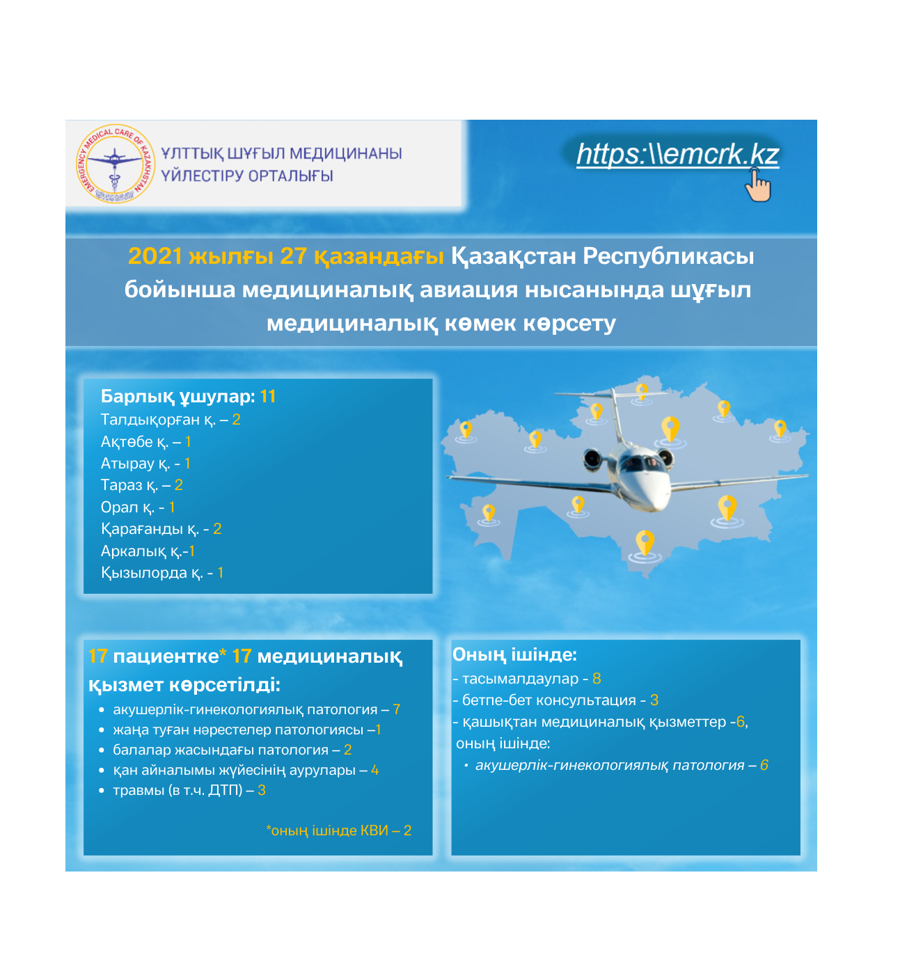2021 жылғы 27 қазандағы Қазақстан Республикасы бойынша медициналық авиация нысанында шұғыл медициналық көмек көрсету