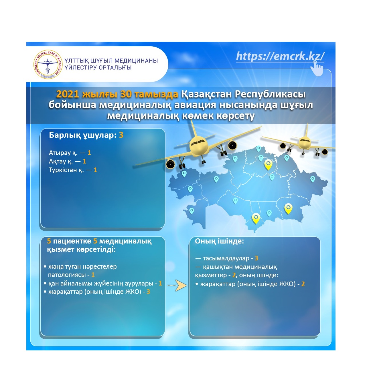 2021 жылғы 30 тамызда Қазақстан Республикасы бойынша медициналық авиация нысанында шұғыл медициналық көмек көрсету