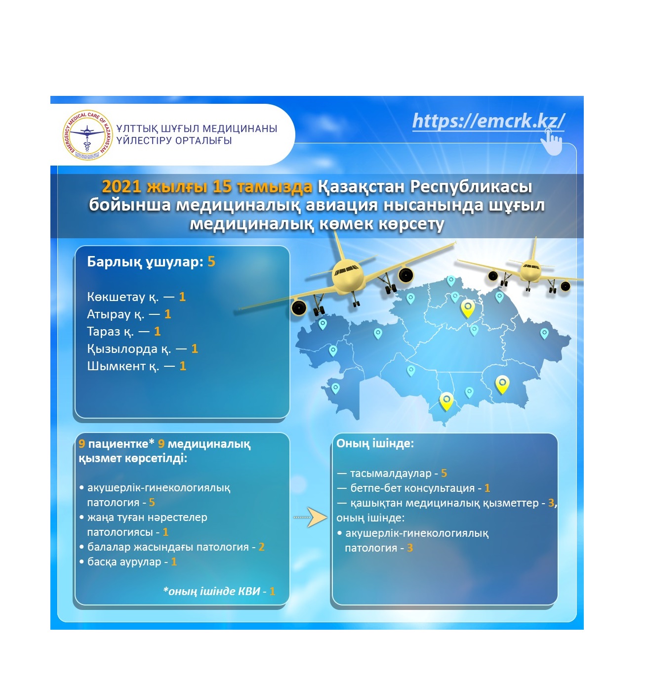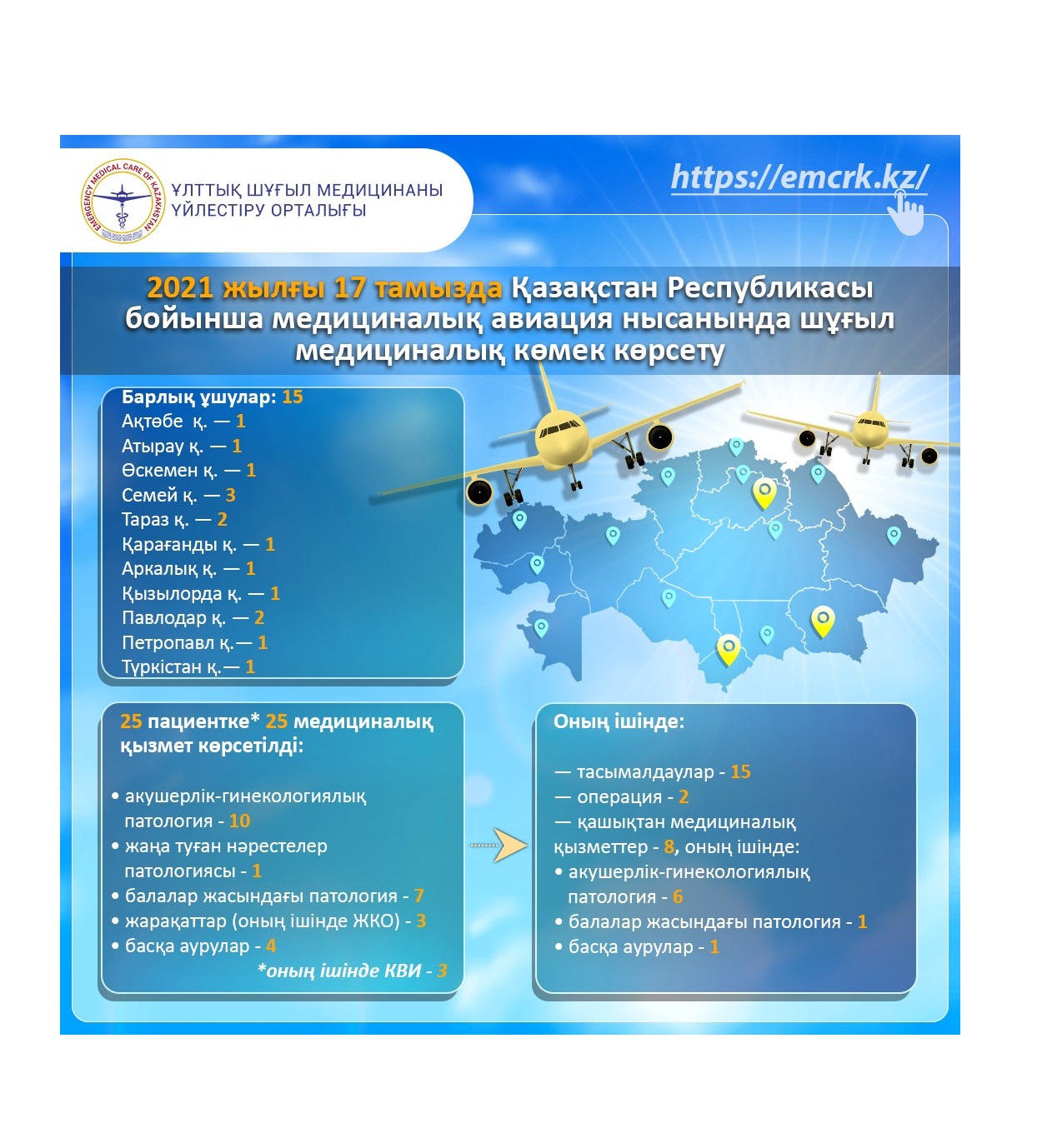 2021 жылғы 15 тамызда Қазақстан Республикасы бойынша медициналық авиация нысанында шұғыл медициналық көмек көрсету