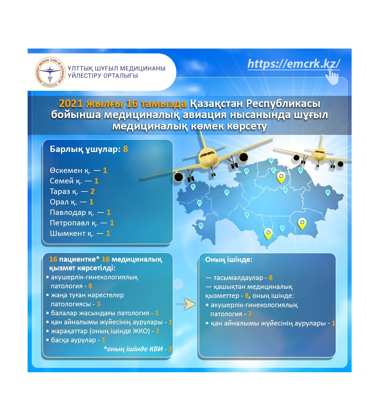 2021 жылғы 16 тамызда Қазақстан Республикасы бойынша медициналық авиация нысанында шұғыл медициналық көмек көрсету