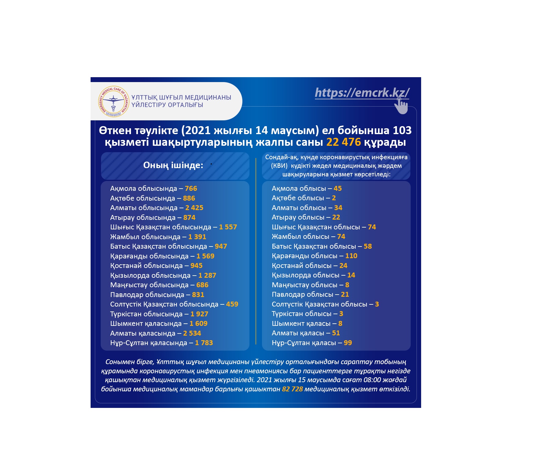 Өткен тәулікте (2021 жылғы 14 маусым) ел бойынша 103 қызметі шақыртуларының жалпы саны 22 476 құрады