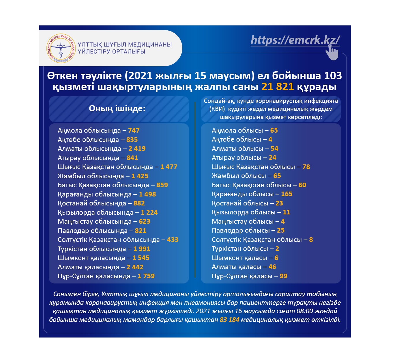 Өткен тәулікте (2021 жылғы 15 маусым) ел бойынша 103 қызметі шақыртуларының жалпы саны 21 821 құрады