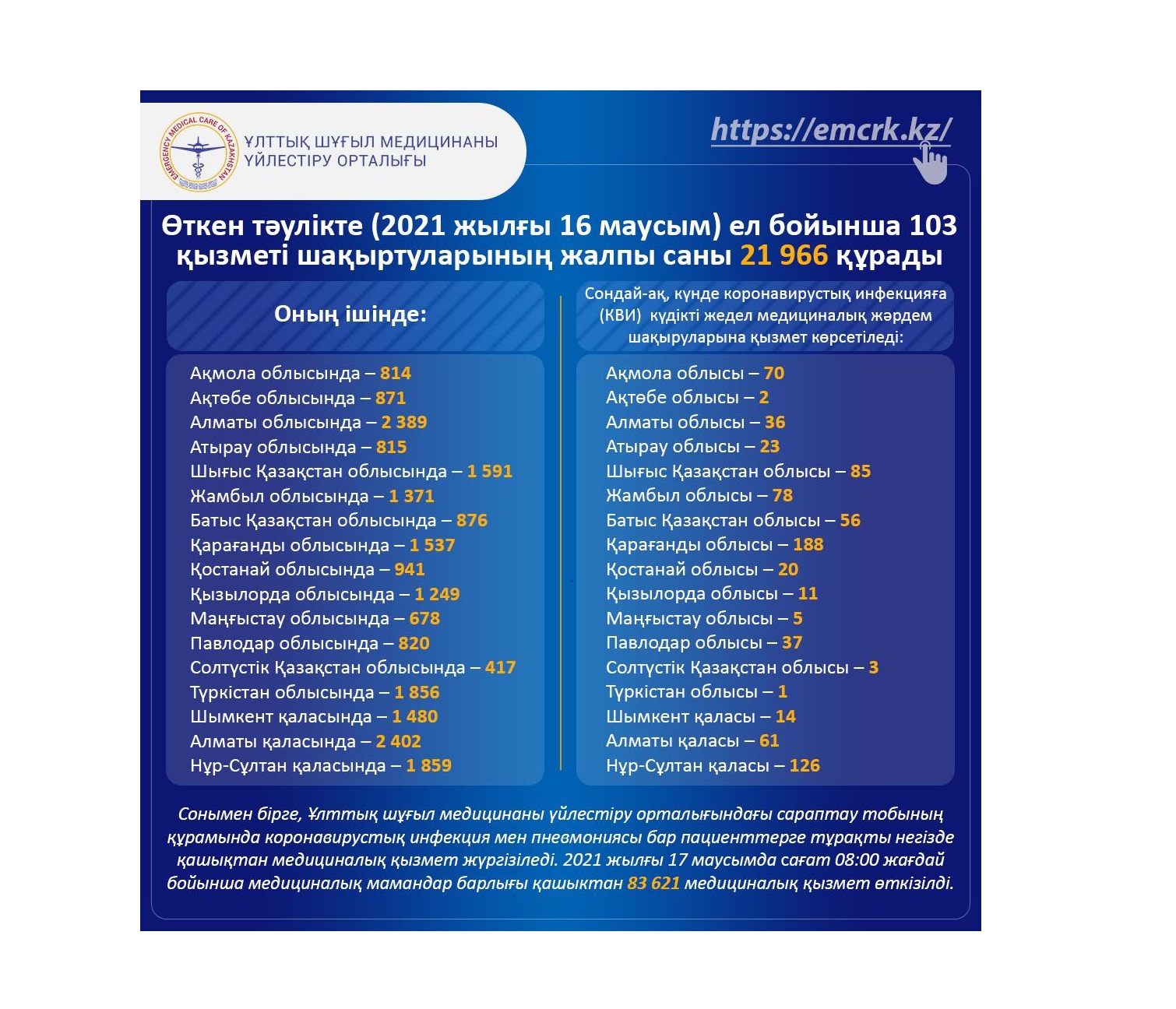 Өткен тәулікте (2021 жылғы 16 маусым) ел бойынша 103 қызметі шақыртуларының жалпы саны 21 966 құрады