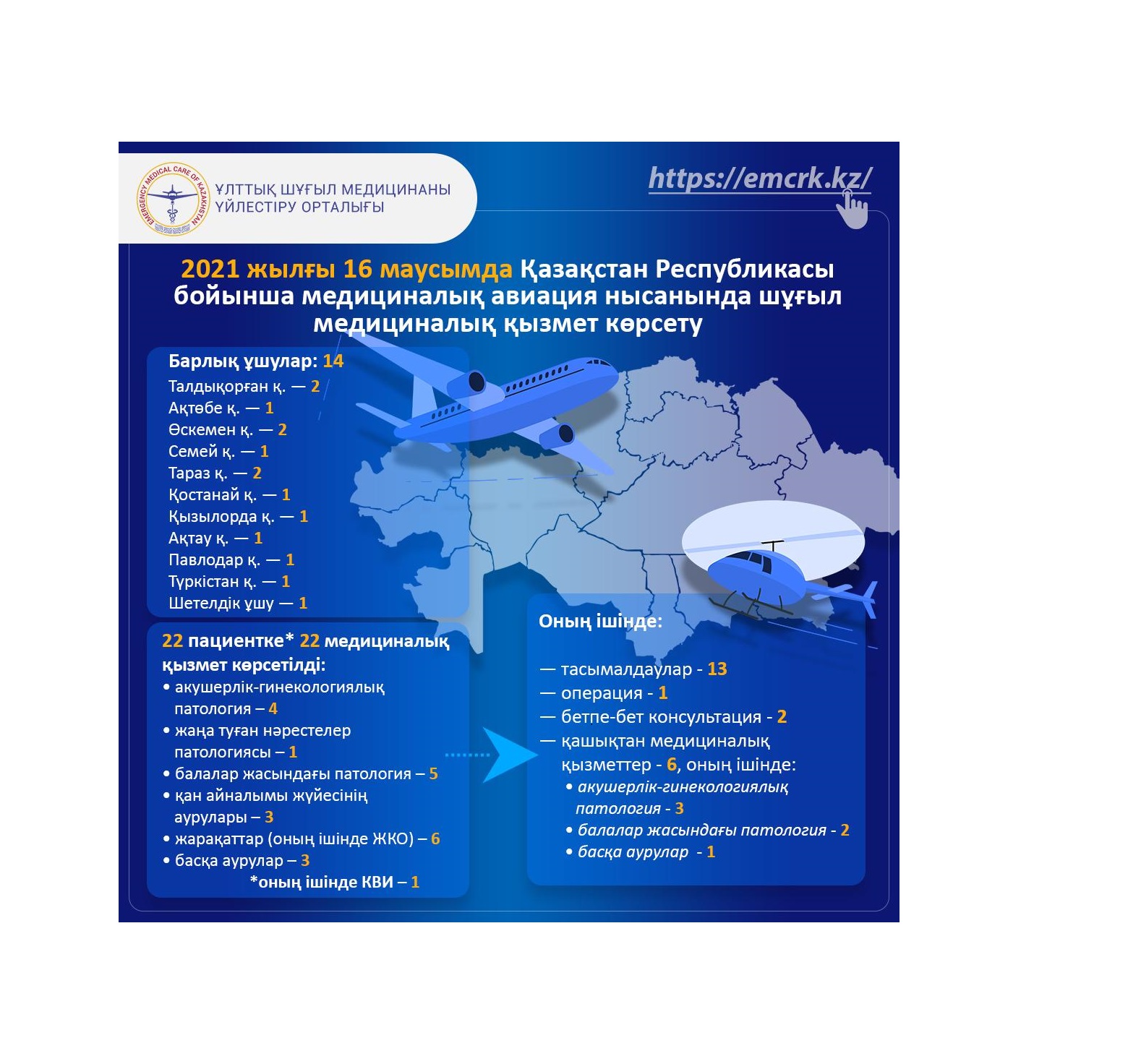 2021 жылғы 16 маусымда Қазақстан Республикасы бойынша медициналық авиация нысанында шұғыл медициналық көмек көрсету
