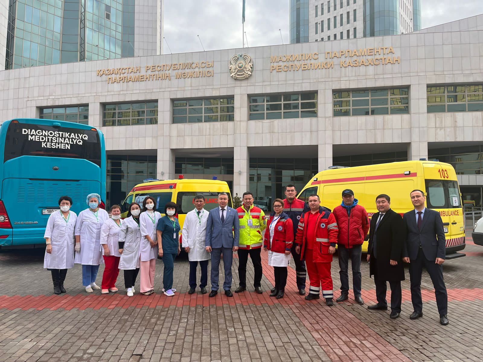 Национальный координационный центр экстренной медицины в рамках Правительственного часа на тему текущего состояния и перспектив развития сельского здравоохранения в Казахстане принял участие в демонстрационной части мероприятия, выставив санитарный транспорт, а также информационный стенд о деятельности организации на площади перед зданием Мажилиса Парламента РК.
