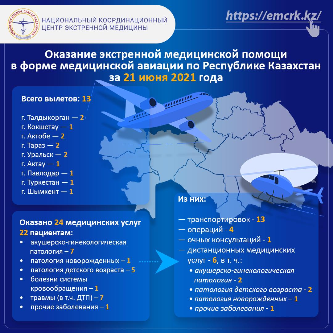 21 июня 2021 года состоялся региональный вылет мобильной бригады медицинской авиации в больницу района Теренколь для транспортировки мужчины 1978 года рождения.