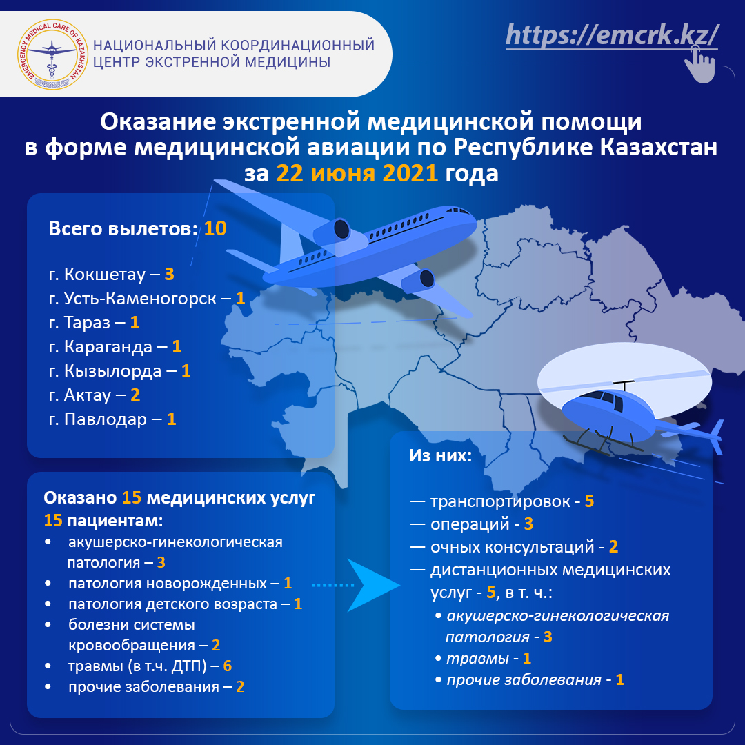 Региональная мобильная бригада медицинской авиации 22 июня 2021 года вылетела по маршруту Костанай – Жаксы – Костанай для транспортировки девушки 2003 года рождения.