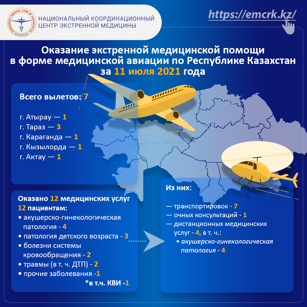 В связи с необходимостью проведения компьютерной томографии, а также из-за отсутствия профильного специалиста – нейрохирурга, 11 июля 2021 года мужчина был транспортирован на вертолете в городскую многопрофильную больницу г. Тараз для оказания специализированной медицинской помощи.
