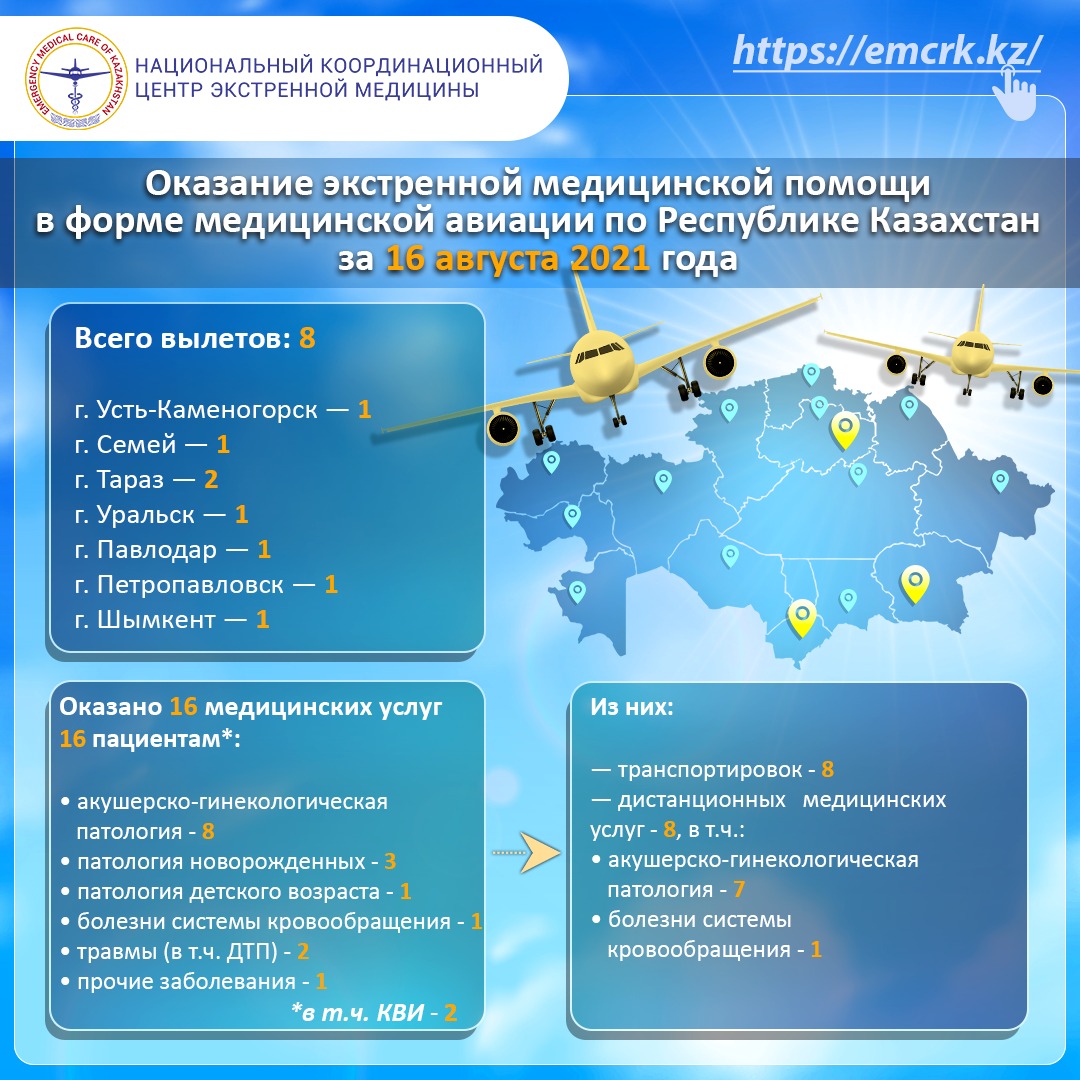 16 августа 2021 года мобильная бригада медицинской авиации в составе 2 реаниматологов транспортировала женщину на вертолете в больницу г.Тараз.
