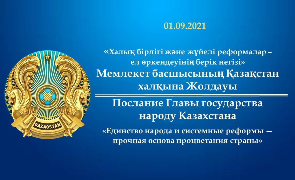 Президент Республики Казахстан Касым-Жомарт Кемелович Токаев 1 сентября 2021 года на совместном заседании палат Парламента обнародовал Послание народу Казахстана «Единство народа и системные реформы – прочная основа процветания страны». Глава государства выступил с рядом инициатив, направленных на дальнейшее развитие страны, повышение эффективности системы здравоохранения, обеспечение качественного образования, совершенствование региональной политики, формирование эффективной экосистемы на рынке труда, политическую модернизацию, защиту прав человека и консолидацию общества. Обращаясь к народу Казахстана, Президент назвал 30-летие Независимости самой высшей ценностью нашего государства.