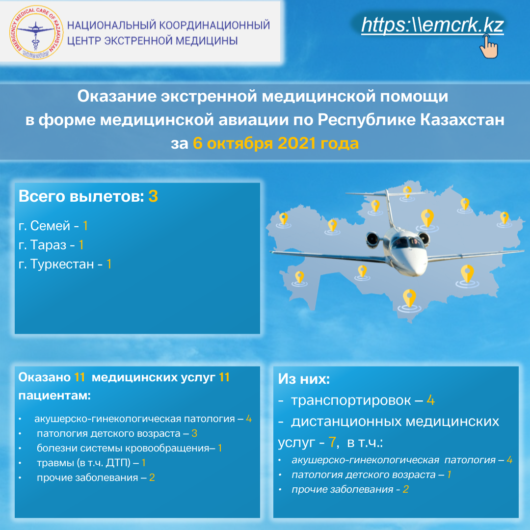 Оказание экстренной медицинской помощи в форме медицинской авиации по Республике Казахстан за 6 октября 2021 года