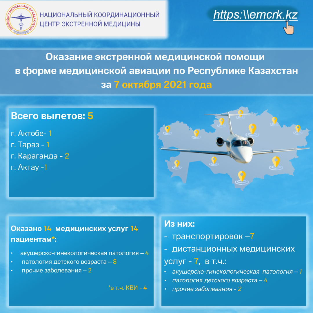Оказание экстренной медицинской помощи в форме медицинской авиации по Республике Казахстан за 7 октября 2021 года