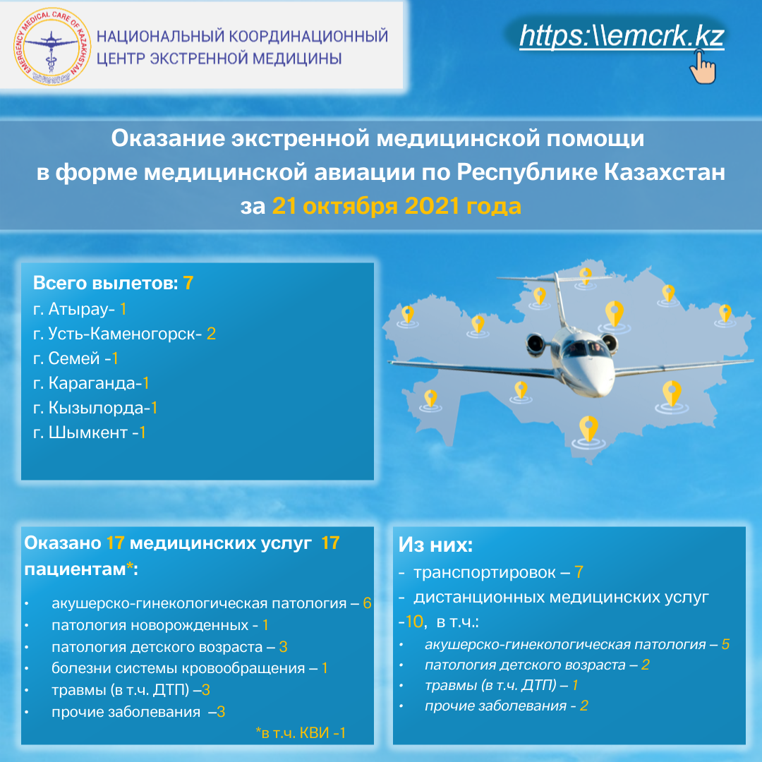 Оказание экстренной медицинской помощи в форме медицинской авиации по Республике Казахстан за 21 октября 2021 года