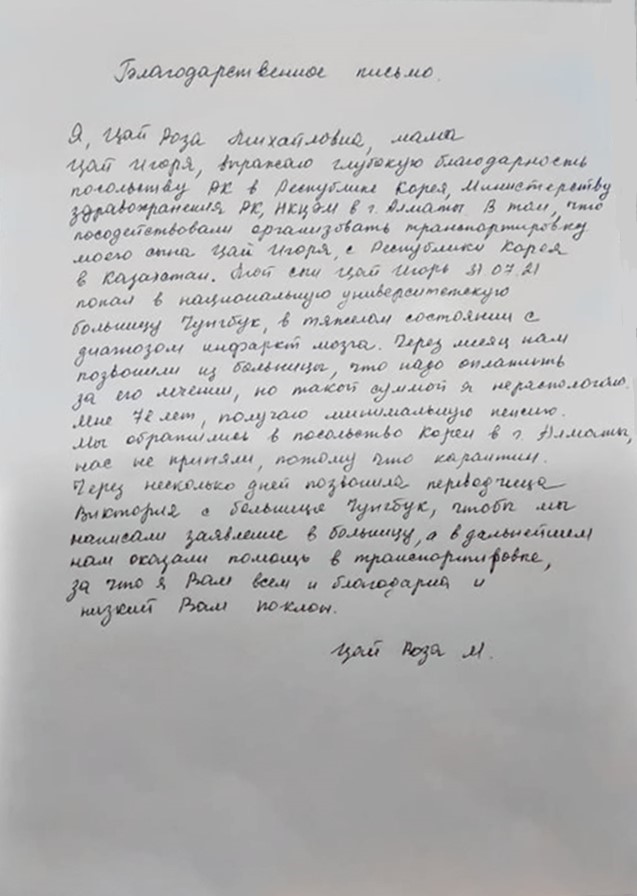 Мен Цай Игорьдің анасы, Цай Роза Михайловна менің ұлымды Корея Республикасынан Қазақстанға тасымалдауды ұйымдастыруда көмек көрсеткендері үшін ҚР-ның Корея Республикасындағы елшілігіне, Қазақстан Республикасының Денсаулық сақтау министрлігіне, Алматы қаласындағы ҰШМҮО-на алғысымды білдіремін. Менің ұлым Цай Игорь 2021 жылғы 31 шілдеде Чунгбук ұлттық университеттік ауруханасына ауыр жағдайда, ми инфарктісі диагнозымен түсті. Бір айдан соң бізге ауруханадан қоңырау шалып, маған емделгені үшін ақша төлеу қажеттігін айтты, бірақ менде ондай қаражат жоқ. Менің жасым 78-де, мен ең төменгі зейнетақы аламын. Біз Алматы қаласындағы Корея елшілігіне жүгіндік, бізді карантинге байланысты қабылдаған жоқ. Бірнеше күннен кейін Чунгбук ауруханасынан аудармашы Виктория хабарласып, бізге ауруханаға өтініш жазу қажеттігін айтты, бұдан әрі бізге тасымалдауда көмек көрсетілді, осы үшін мен Сіздердің барлықтарыңызға алғыс айтып, басымды иемін.
