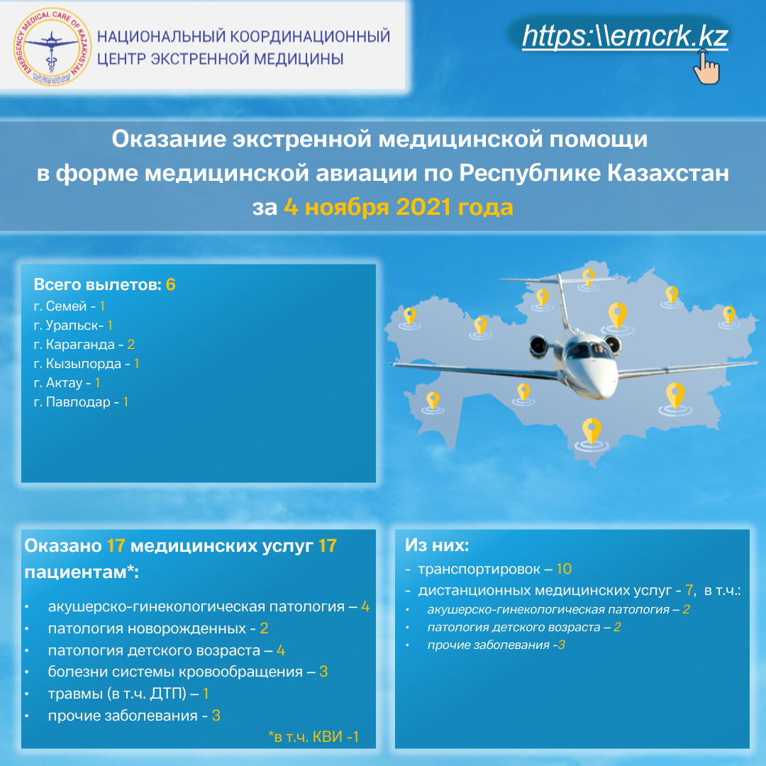 Оказание экстренной медицинской помощи в форме медицинской авиации по Республике Казахстан за 4 ноября 2021 года