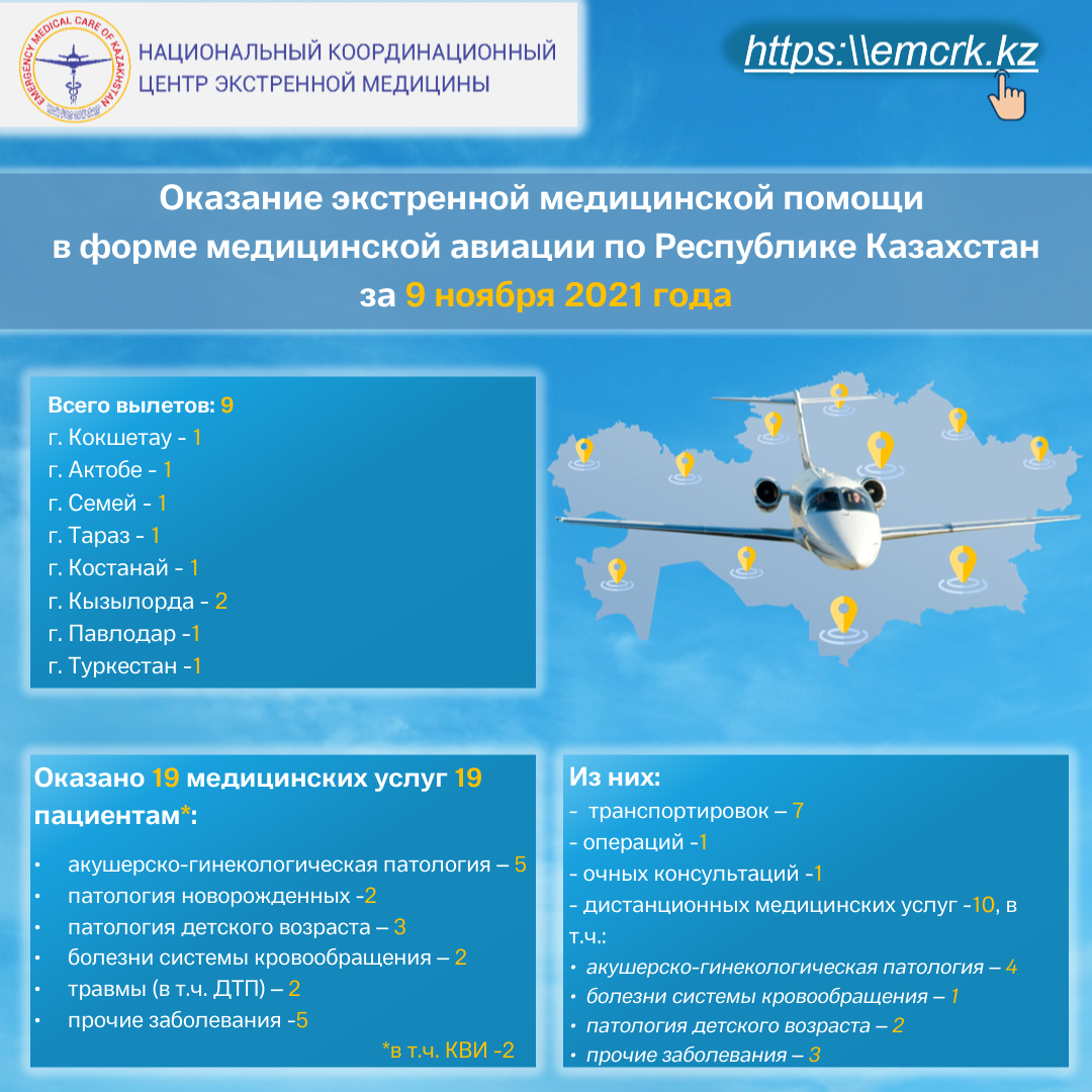Оказание экстренной медицинской помощи в форме медицинской авиации по Республике Казахстан за 9 ноября 2021 года