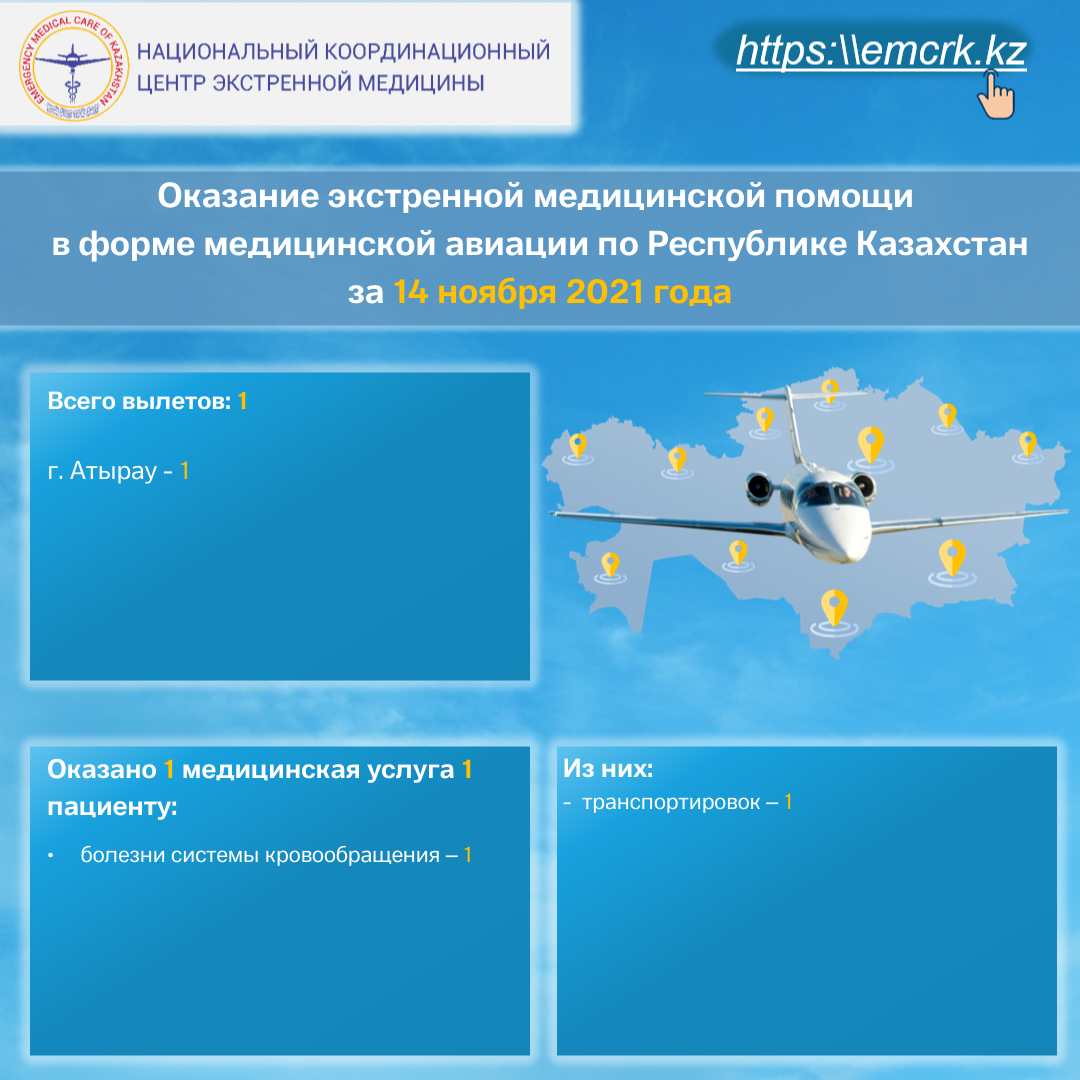 Оказание экстренной медицинской помощи в форме медицинской авиации по Республике Казахстан за 14 ноября 2021 года