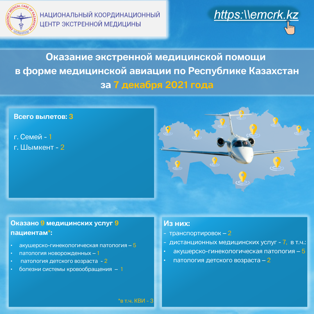 Оказание экстренной медицинской помощи в форме медицинской авиации по Республике Казахстан за 7 декабря 2021 года
