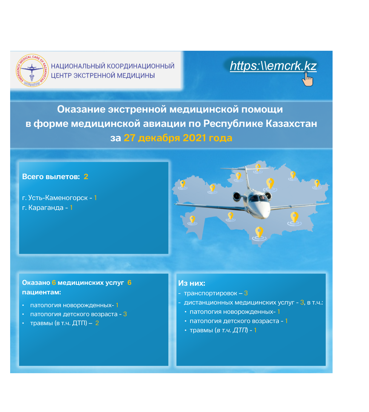 Оказание экстренной медицинской помощи в форме медицинской авиации по Республике Казахстан за 27 декабря 2021 года