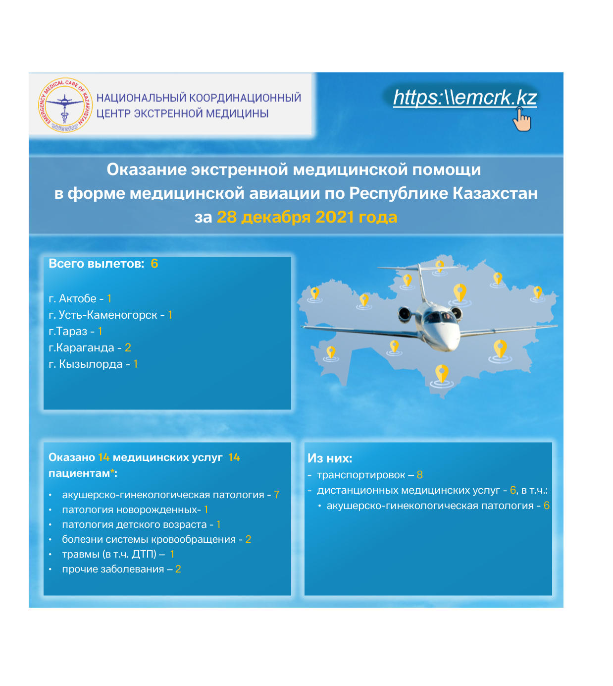 Оказание экстренной медицинской помощи в форме медицинской авиации по Республике Казахстан за 28 декабря 2021 года.