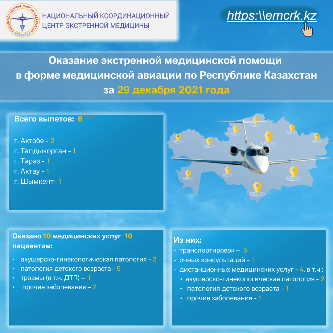 Оказание экстренной медицинской помощи в форме медицинской авиации по Республике Казахстан за 29 декабря 2021 года.