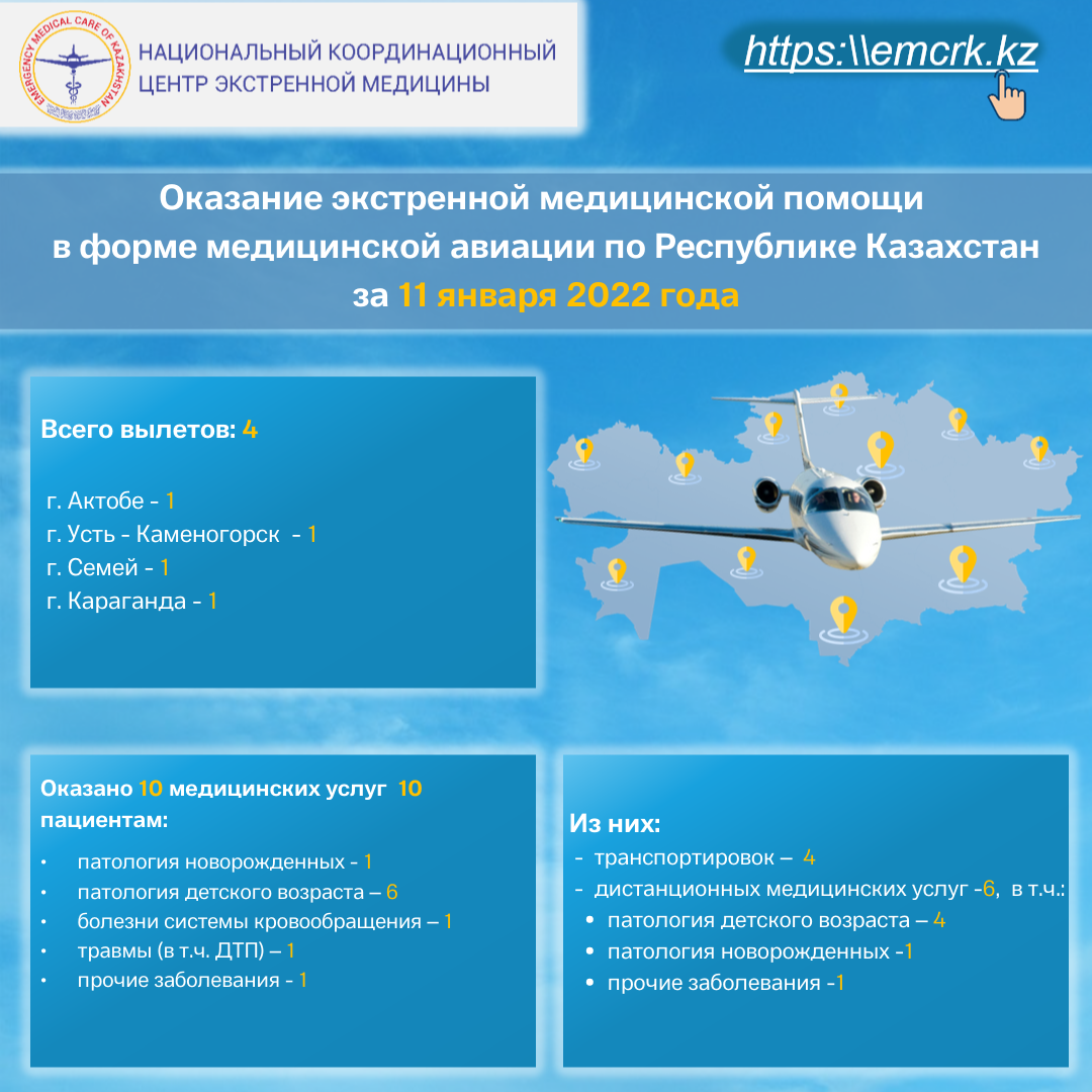 Оказание экстренной медицинской помощи в форме медицинской авиации по Республике Казахстан за 11 января 2022 года