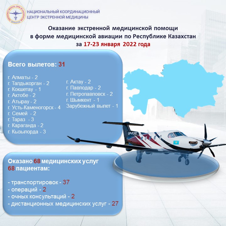 Оказание экстренной медицинской помощи в форме медицинской авиации по Республике Казахстан за 17 - 23 января 2022 года