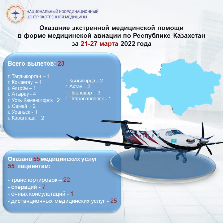 Оказание экстренной медицинской помощи в форме медицинской авиации по Республике Казахстан за 21-27 марта 2022 года